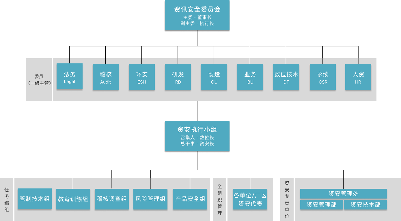 资讯安全委员会为350vip8888新葡的京资安最高管理组织,向董事长报告。下辖资安执行小组负责推行资讯安全委员会之各项决议。为持续建构完整且精实的资安专 责团队,资讯安全管理处下成立「资讯安全管理部」与「资讯安全技术部」,持续投入资源以强化团队资安核心能力。
