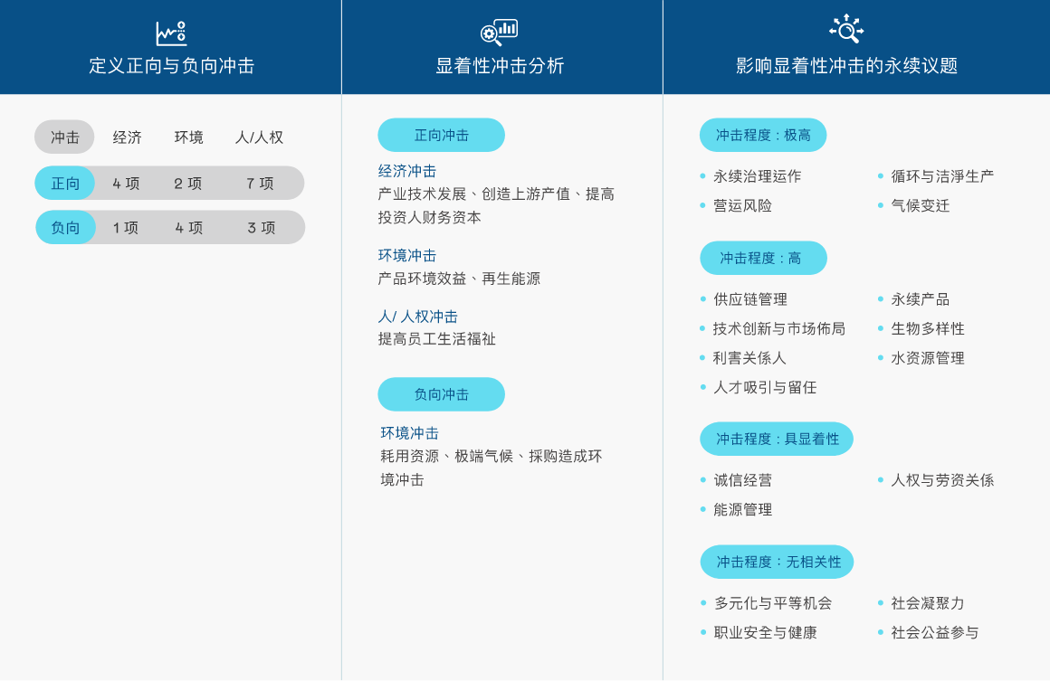 依循全球永续趋势与GRI 准则检视议题之合适性,透过问卷了解利害关系人对公司在环境、社会( 含人权)、公司治理三方面的关注面向,同时建立双重重大性评估方法,透过350vip8888新葡的京主管与价值链的关键伙伴评估ESG 议题对公司所产生的营运冲击程度,并在ESG 外部永续发展冲击方面,根据GRI 通用准则2021(GRI Universal Standards 2021) 的GRI 3:重大主题(Material Topics 2021),整合价值平衡联盟(Value Balancing Alliance, VBA)、哈佛商学院「影响力加权会计(Impact-Weighted Accounts)」研究计画等机构发展之经济、环境及社会层面冲击评估方法学,建构以冲击为基础的重大性分析流程,辨识重大性主题。