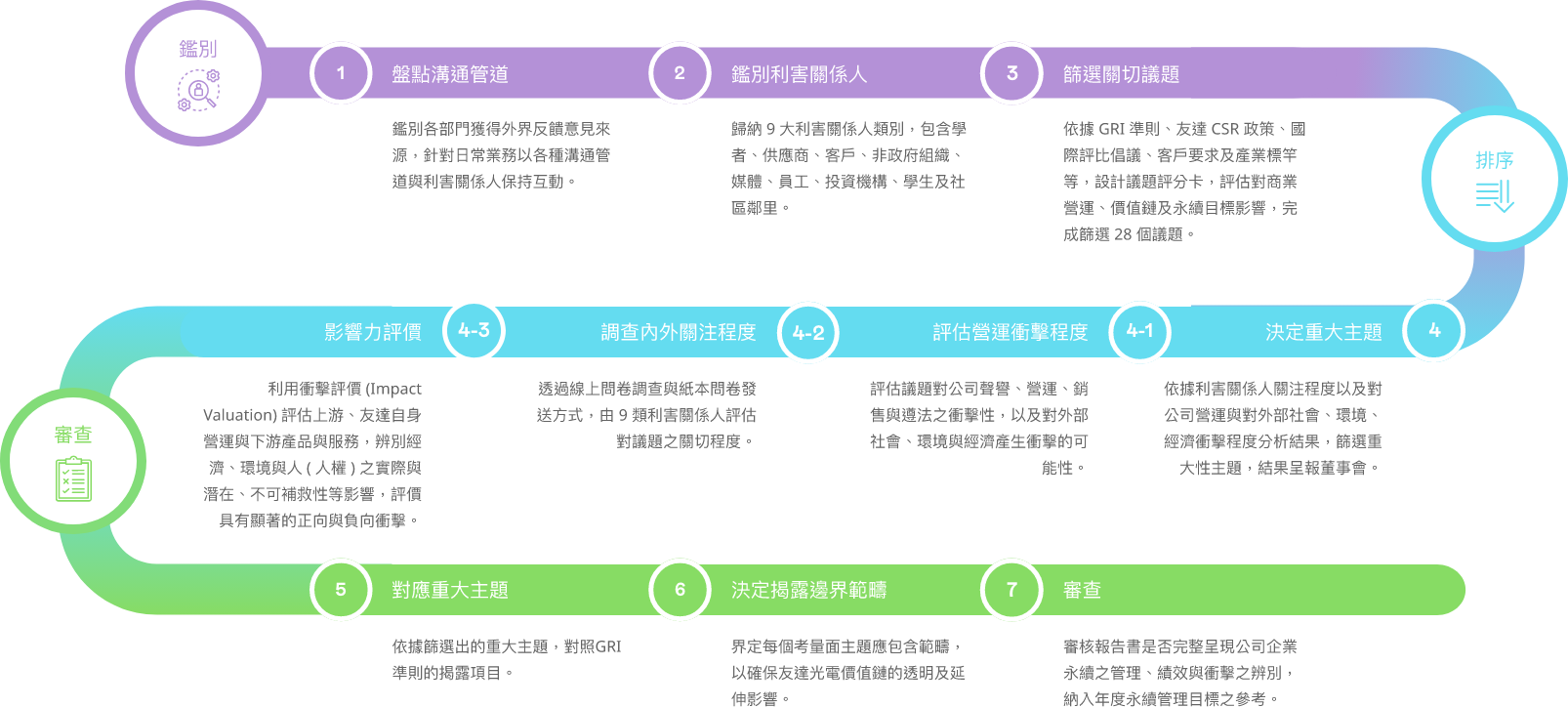 依循全球永續趨勢與 GRI 準則檢視議題之合適性,透過問卷瞭解利害關係人對公司在環境、社會 ( 含人權 )、公司治理三方面的關注面向,同時 建立雙重重大性評估方法,透過350vip8888新葡的京主管與價值鏈的關鍵夥伴評估 ESG 議題對公司所產生的營運衝擊程度,並在 ESG 外部永續發展衝擊方面,根據 GRI 通用準則 2021(GRI Universal Standards 2021) 的 GRI 3: 重大主題 (Material Topics 2021),整合價值平衡聯盟 (Value Balancing Alliance, VBA)、哈佛商學院「影響力加權會計 (Impact-Weighted Accounts)」研究計畫等機構發展之經濟、環境及社會層面衝擊評估方法學,建構以衝擊為基礎的重大性分析流程,辨識重大性主題。