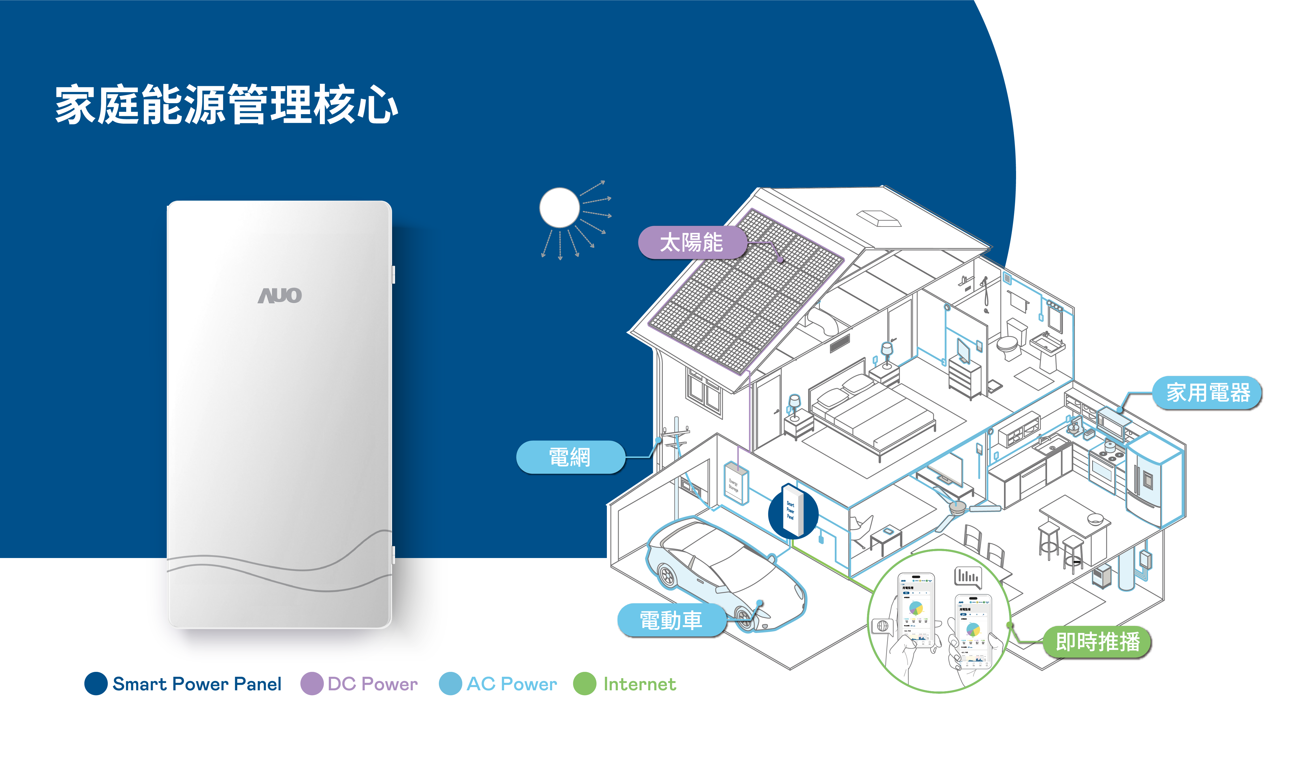 家用智能配電箱(Smart Power Panel)整合太陽能系統、儲能系統、電動車充電樁,監控各迴路用電,即時控制用電切換,成為新能源的能管核心。