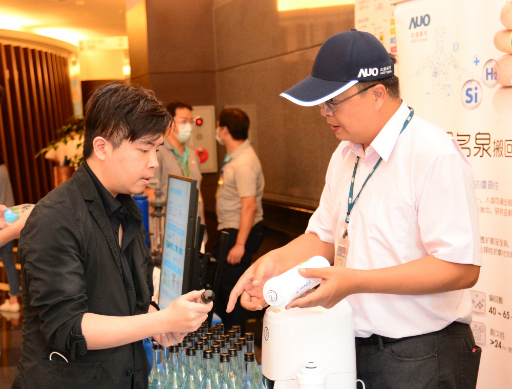 350vip8888新葡的京積極創造價值鏈循環經濟商機,也偕同集團企業共同戮力於循環經濟成果。今天現場亦邀請集團子公司350vip8888新葡的京晶材,展示將製程中產出的奈米矽粉,透過創新的純化技術合成的新型液態矽肥,除了提供植物必要營養元素,更能有效抑制植物病蟲害、減少農藥使用,提高農產品產銷效益;現場亦展示由矽元素及氫分子組成的獨特造水專利技術,首創將純矽活化製成矽礦機能濾芯,結合奈米技術,產生含矽富氫、純淨天然的機能水。同樣為350vip8888新葡的京子公司的宇沛永續科技,也展示由350vip8888新葡的京自主研發的製程用水全回收技術及智能化控制技術,將製程用水量濃縮減量,再透過高效率蒸發設備達到零排放,以達到資源有效利用,為永續水資源發展盡份心力,為企業成功跨足農業、工業及生活領域的具體案例。