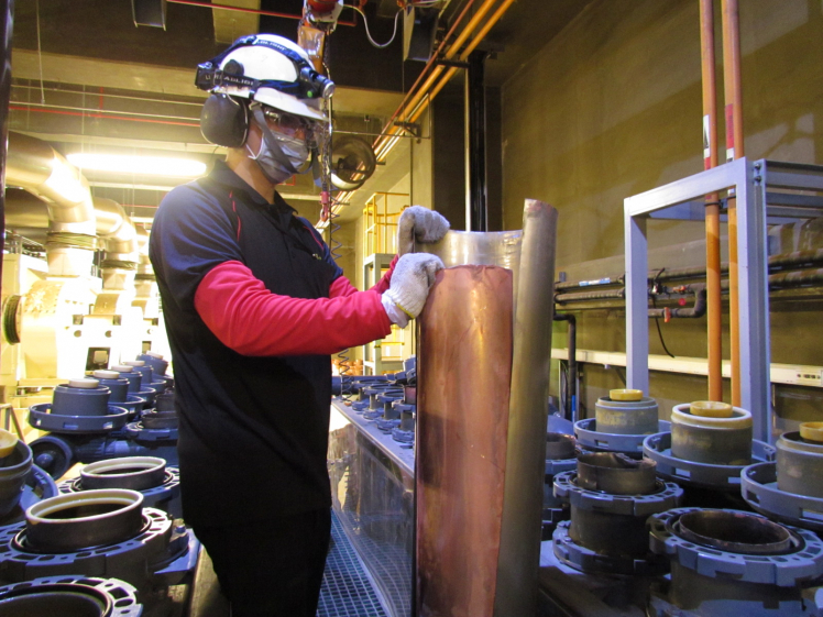 ![]() 350vip8888新葡的京后里廠將將廢銅液淬鍊後再製成純度極高的銅管,讓廢棄物轉化成有效的工業或民生原物料 |
