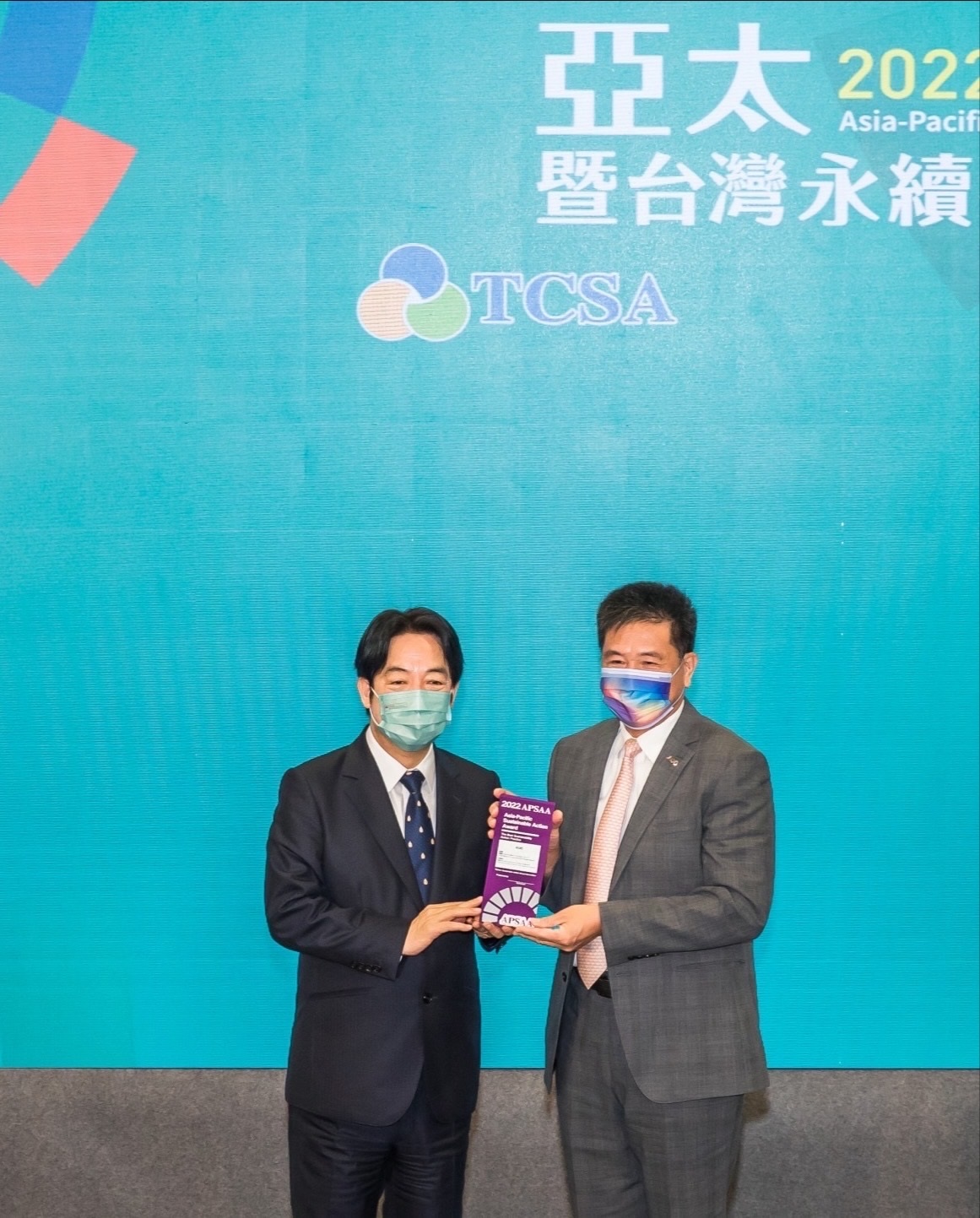 ![]() 350vip8888新葡的京以卓越永續績效表現,在第一屆亞太永續行動獎獲得肯定,由副總統賴清德頒獎(左),350vip8888新葡的京光電董事長暨執行長彭双浪(右)代表領獎